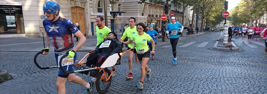 Au détour des rues qui défilent, la foule encourage et la musique résonne. Les relais sur la joëlette s’enchainent. Tendue comme un string, j’attrape le bolide avec maladresse, mais Jean-Paul et Choupi sont là pour driver les nouveaux. Quelle fierté de pouvoir en être ! Alain, se débrouille comme un chef pour cette première fois, tellement bien qu’il tape des sprints dans le Bois de Boulogne avec Captain America. Bye Bye !! On se retrouve au prochain ravito.
