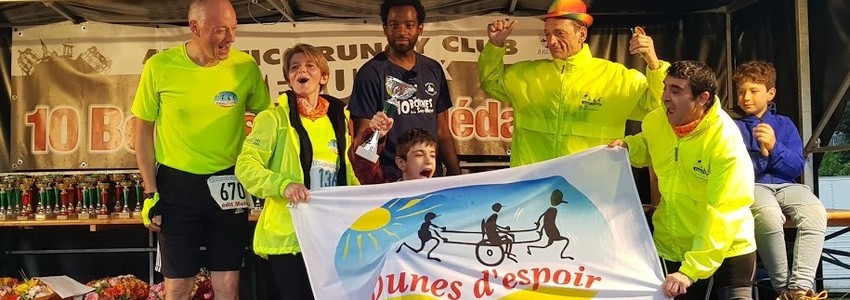 Quelques mots au micro sur notre association et après un bon ravito toute l’équipe et la famille se retrouve autour du podium pour fêter notre vainqueur du jour “Loïc et sa belle coupe”.